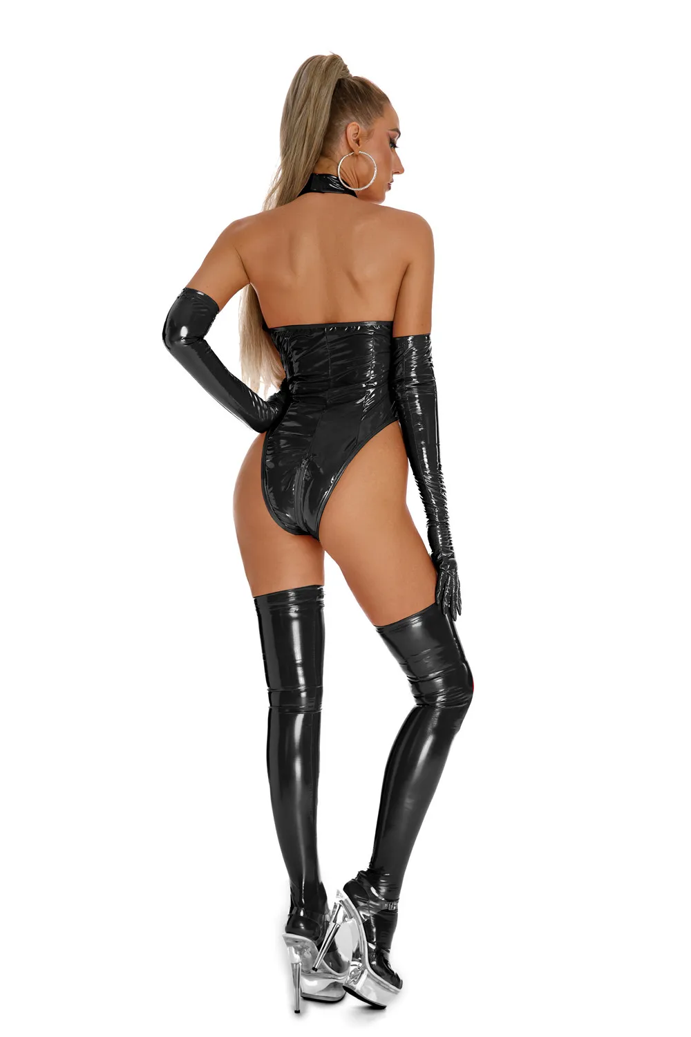 Womens Latex Catsuit Wet Look Lace-Up Body PVC Teddy Fetish Bodysuit Exotic Parties Night Club Wear Pole Dancing Full Set